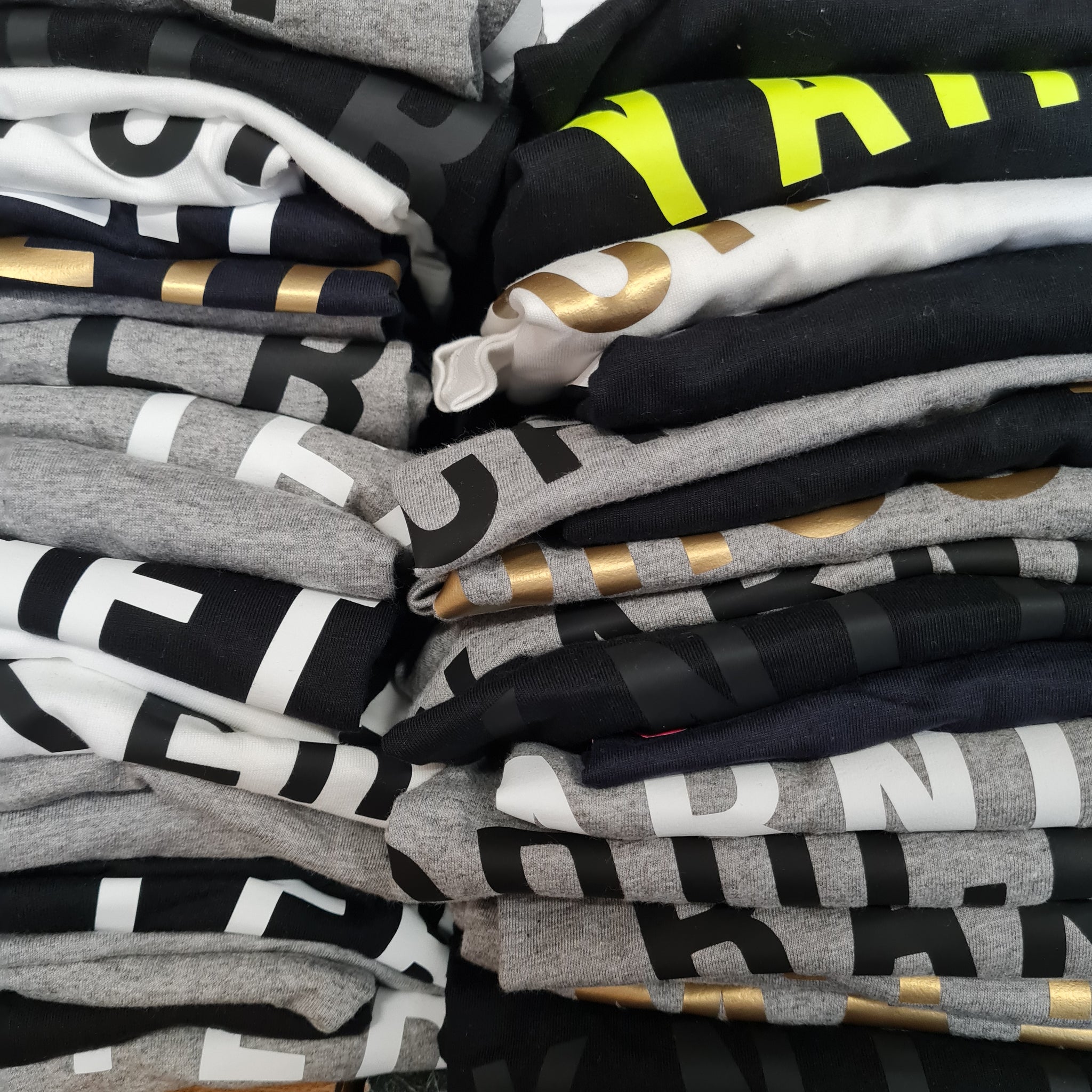 This is the unisex/classic style tee, which is available in Black, White, Navy and Grey, with a hand cut and applied vinyl logo.